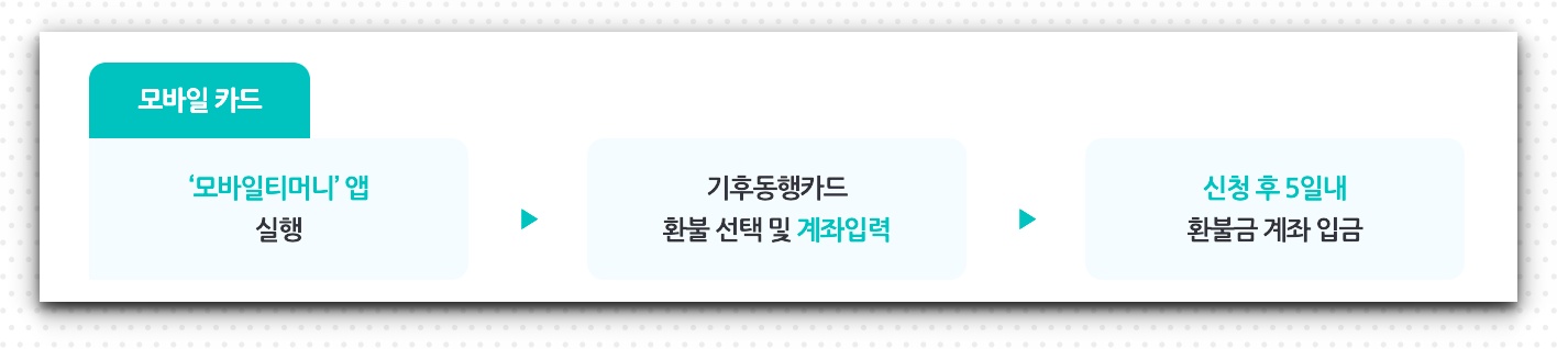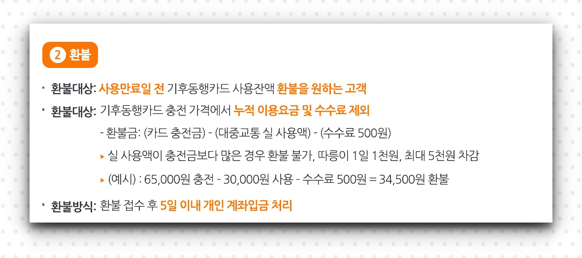 기후동행카드의 환불 방법에 대해 알아보겠습니다. 환불 대상자는 사용 만료일 이전에 기후동행카드의 잔액 환불을 원하는 고객입니다. 환불 대상 금액은 기후동행카드 충전 금액에서 사용한 금액과 수수료를 제외한 금액입니다.
