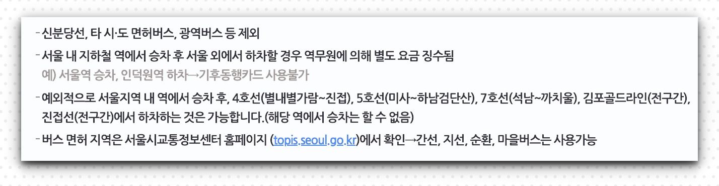 기후동행카드의 사용 범위는 서울 지역 내 지하철, 버스, 따릉이에 한정됩니다. 경기권에서 출퇴근하는 경우, 서울시 면허의 시내버스를 이용할 때는 서울시 외 지역에서도 기후동행카드를 사용할 수 있습니다. 그러나 지하철의 경우 서울시 노선이더라도 서울시 밖에서 하차하는 경우에는 기후동행카드 사용이 불가능합니다.