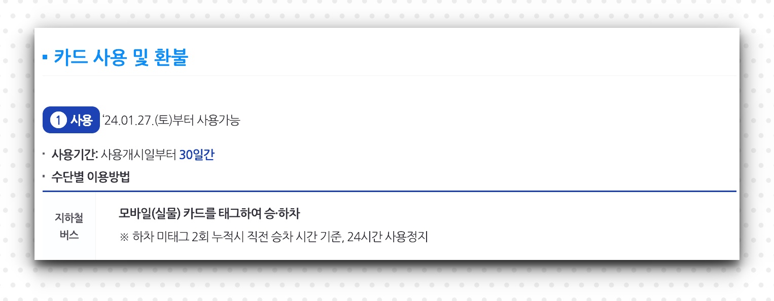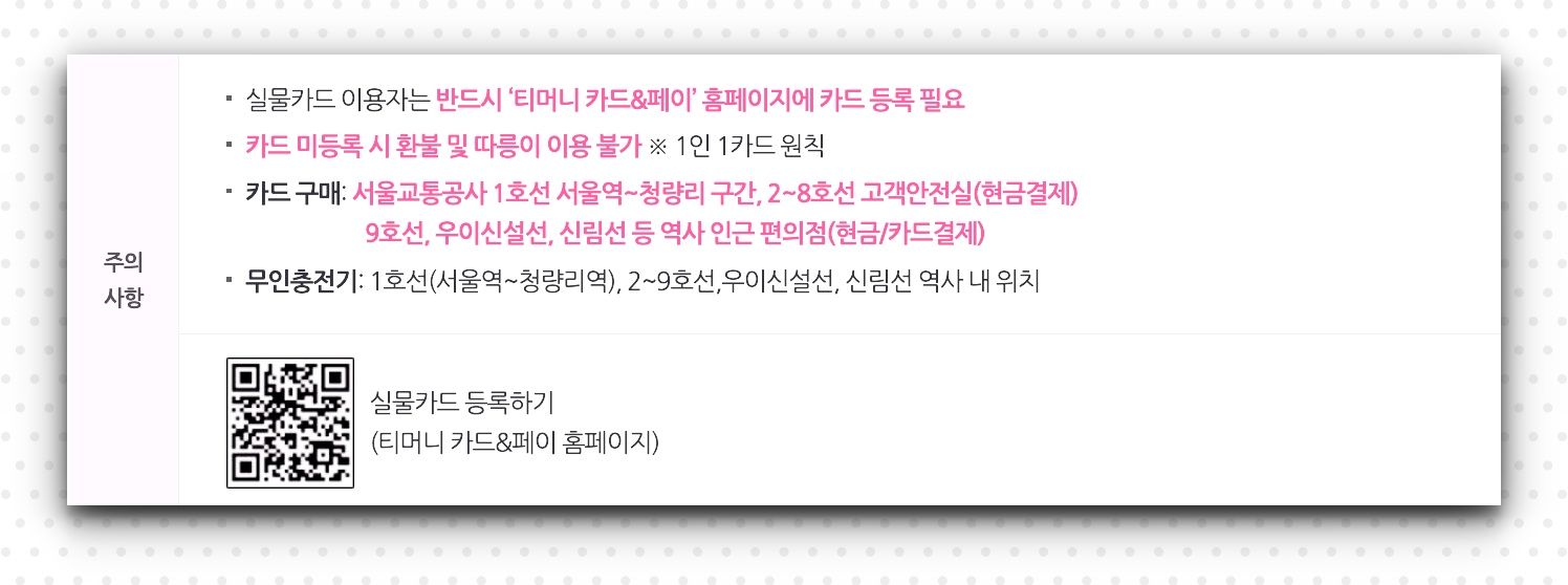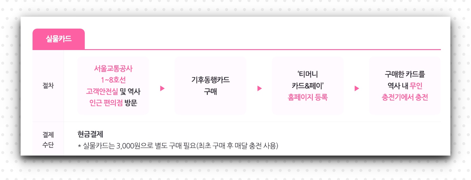 실물카드는 주로 모바일 사용에 익숙하지 않은 어르신분들에게 좋을거 같습니다. 다만, 실물카드 구매시 3,000원의 비용이 발생하며, 최초 구매 후 매달 충전하여 사용하는 방식입니다. 실물카드 사용자는 기후동행카드 홈페이지에 카드를 등록해야 사용 및 환불이 가능합니다.