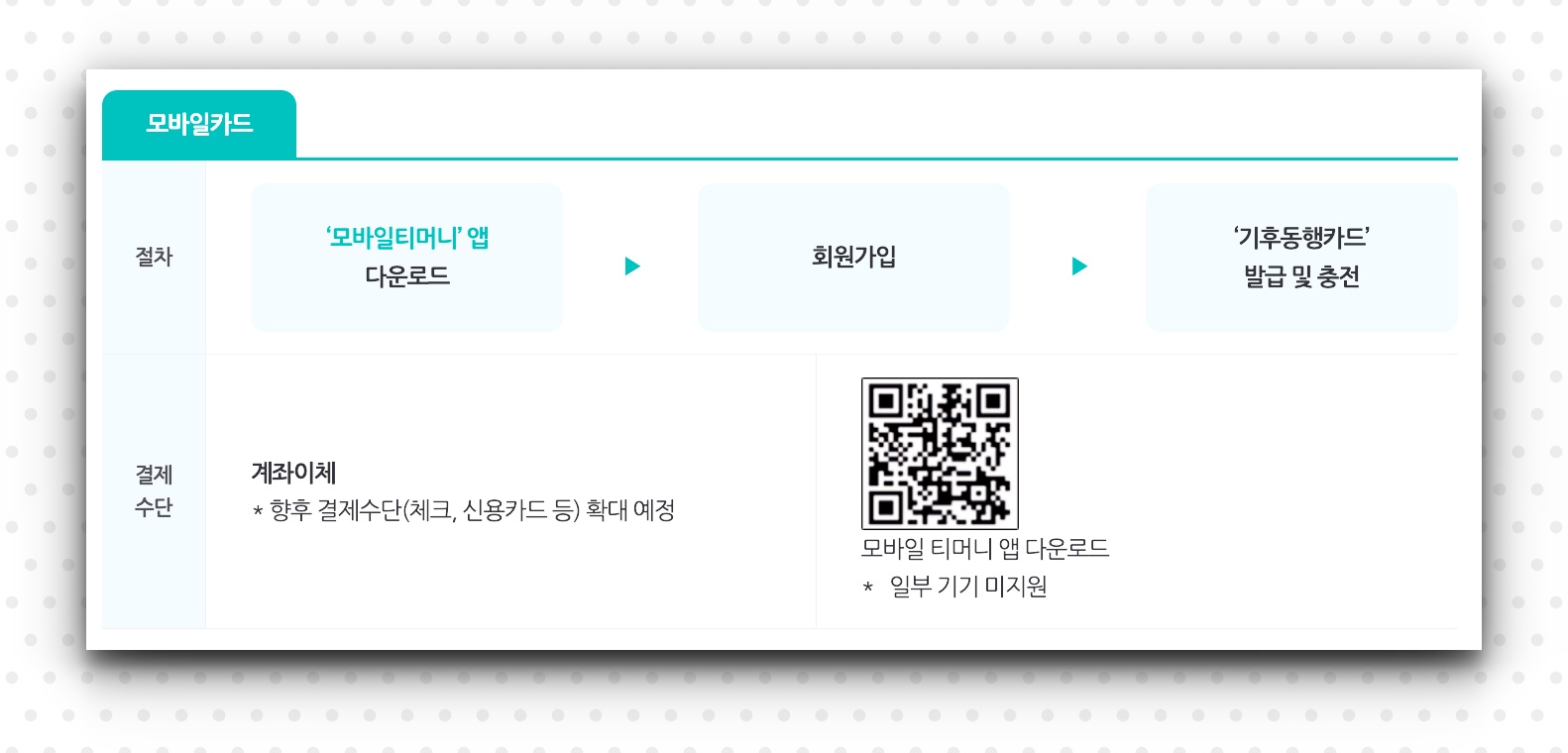 모바일카드를 이용하려면 먼저 '모바일 티머니' 앱을 다운로드하고 회원가입을 해야 합니다. 그 후에 기후동행카드를 발급받아 충전하여 사용할 수 있습니다. 현재는 계좌로만 충전 가능하지만, 향후에는 다른 방법으로도 기후동행카드 이용이 가능하다고 합니다.