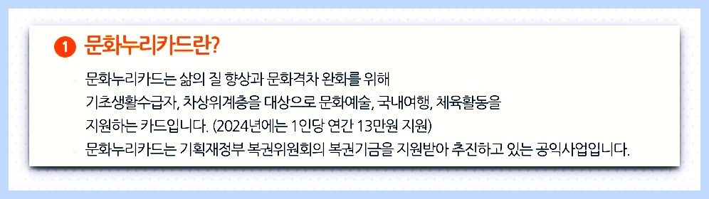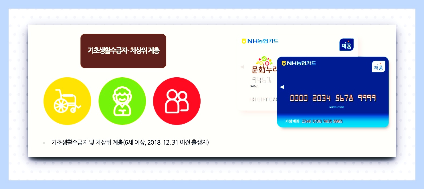 문화누리카드는 기획재정부에서 진행한 차상위계층과 기초생활수급자의 문화생활에서 부족한 점을 해결하기 위한 제도로 복권위원회의 도움을 받아 진행되는 공공사업인데요. 지원해택으로는 연간 1인당 10만원이 지급이 되는데요. 카드를 합해서 사용할 수 있고, 연간 누적 사용 금액은 200만원입니다.